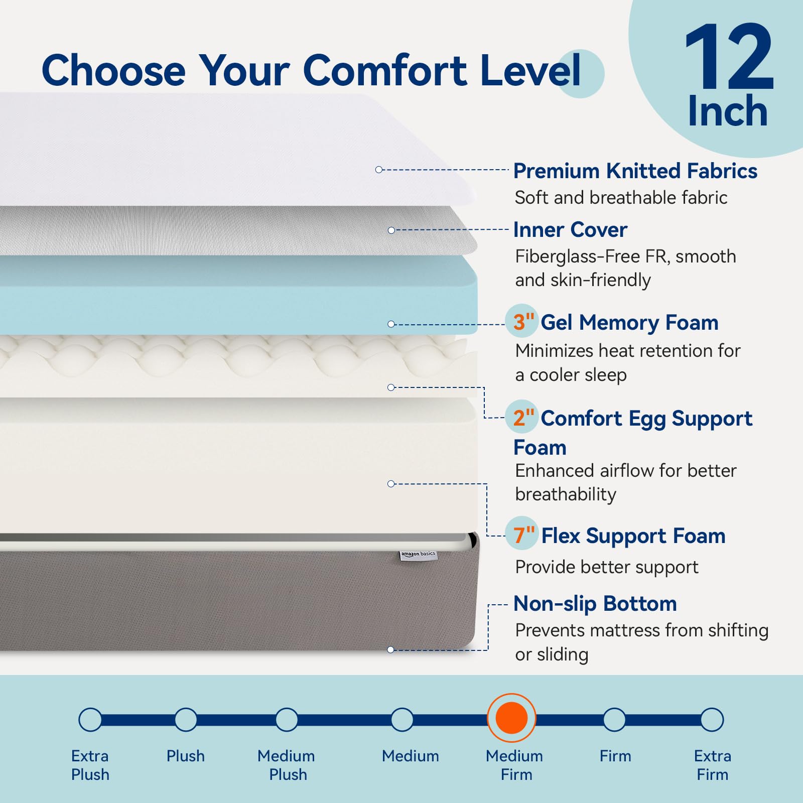 - 💕Firm-feeling : Our Amazon Basics 12 inch gel memory foam mattress cal king size includes 3 inches of gel memory foam, 2 inches of comfort support foam and 7 inches of flex comfort foam for a medium firm feel. This cal king bed mattress conforms to different sleep positions and is ideal for side, back and stomach sleepers, providing you with comfortable and cloud-like sleep.