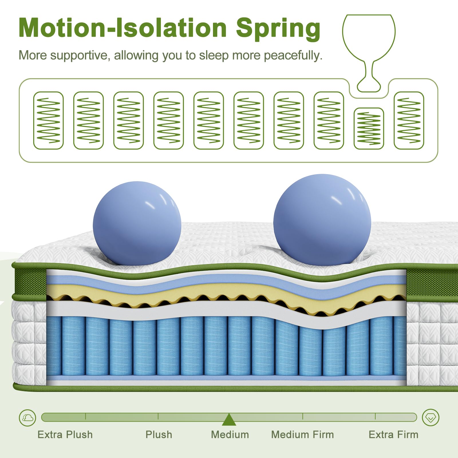 - Pocket Spring Hybrid Mattress -BedStory king mattress is supported by hundreds of quality and stainless Individual pocket spring, each spring work independently to offer an all-over and average support to 7 parts of your body (Feet, legs, hips, waist, shoulders, neck, head). These pocket springs can effectively absorb the noise and vibration caused by turning over during sleep, do not disturb your companions, and sleep peacefully.